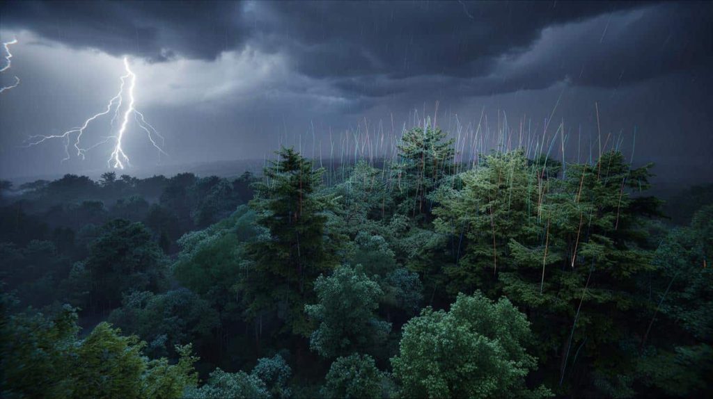Wer bei Gewitter in den Wald schaut, sieht das Vertraute: Blitze, die den Himmel zerreißen, dunkle Wolkenmassen, peitschenden Regen. Was