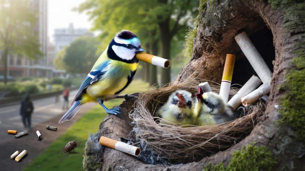 Wer eine Blaumeise beobachtet, die einen Zigarettenstummel im Schnabel trägt, denkt zuerst an Gleichgültigkeit – die der Raucher, die achtlos